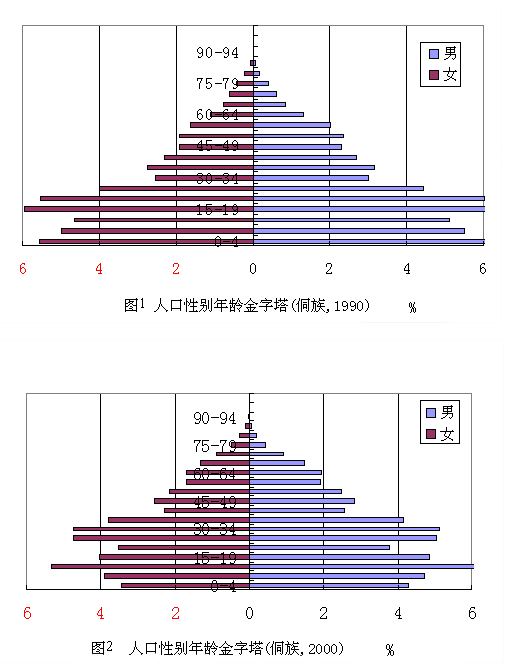 从各年龄段的人口比例看,少年儿童人口(0-14岁)比重为 27.79%,劳动年龄人口(15-64岁)比重为66.03%,老年人口(65岁及以上)占6.18%,与1990年相比,少年儿童人口比重下降了4.43个百分点,劳动年龄人口比重和老年人口比重分别增加了2.48和1.95个百分点。1990年和2000年侗族人口的性别年龄结构如图1和图2所示。