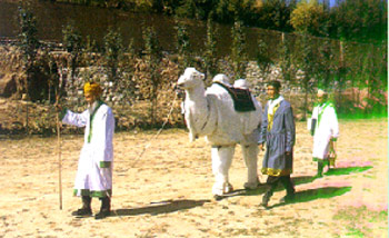 关于撒拉族的历史来源,本民族有如下口头传说:很久以前,在中亚撒马尔罕地方,有尕勒莽、阿赫莽两兄弟,在族人中很有威望,备受尊崇,但遭到国王的嫉恨,于是告别故土,率领族人,向东进发,去寻找新的乐土。他们翻山越岭,涉水过滩,到达新疆,然后沿天山北路东进,到达嘉峪关。入关后经河西走廊到秦州(天水),辗转到了甘肃夏河甘家滩,在此小歇。之后,又有45人跟踪而来,他们经天山南路入青海,沿青海湖南岸,进入贵德县园珠沟,有人劳累不堪,无力西行,暂时住下,其余人继续前进。后到循化县的夕厂沟,跨过孟达山,上奥图斯山时,因天已昏暗,驮经骆驼走失,他们点起火把寻找,找到沙子坡(今街子乡东边)时,天已破晓。后人把此山坡叫“奥特波依纳赫”,即“火坡”之意,山下的村庄叫“奥特波依纳赫村”。撒拉语称此处为“唐古提”(实为唐阿提),意为“天亮了”。黎明时,他们发现街子一带土地平衍、清流纵横、山林环绕,是得天独厚的好地方,他们走到一清泉边,饮泉水甘美可口,忽见丢失的骆驼卧在泉水溪流中,两峰突出水面化为白石,石峰上放着《古兰经》。他们悲喜交集,取出随身所带水土和当地水土一测试,与故乡水土相同,于是便在此定居下来。至今街子地方有骆驼泉遗址和骆驼石遗迹,引起人们对这一传说的遐想,这个遥远的传说曾被创作成撒拉族舞蹈。