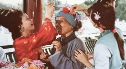 王熙凤把所有花儿都往刘姥姥头上招呼,很快,一个花团锦簇的刘姥姥别致的出场了,成功博得贾母及现场所有的人大笑开怀。