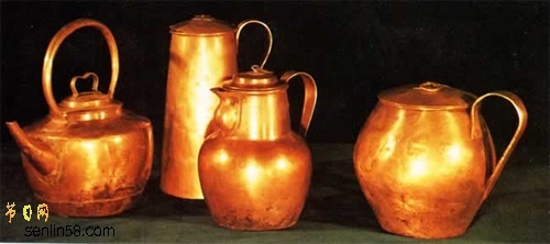 錾花东布。即高筒壶,盛茶或奶。为圆椎形,高1-1.5尺左右。有以木制,上面有四道或五道金属制成的箍。有以铜制,结实耐用。