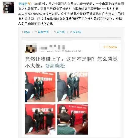 微博截图同年,高晓松还发微博吐槽自己被“山寨”,在某企业的发布会现场,打着“高晓松再现《同桌的你》”的广告,出现的却是山寨“高晓松”杨智勇。之后,该男子回应,已经向高晓松道歉。