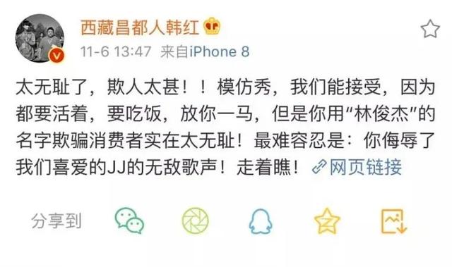微博截图2018年,歌手韩红也曾发微博谴责“山寨林俊杰”,“模仿秀,我们都能接受,因为都要活着,要吃饭,放你一马,但是你用‘林俊杰’的名字欺骗消费者就太无耻情感文案网名!”据了解,从2013年开始,一名叫范一贤的模仿者就借模仿林俊杰参加各类节目。有时参加商演时,更是直接对外宣传是林俊杰本人的活动。后据媒体报道,双方已经达成和解,并互相监督。