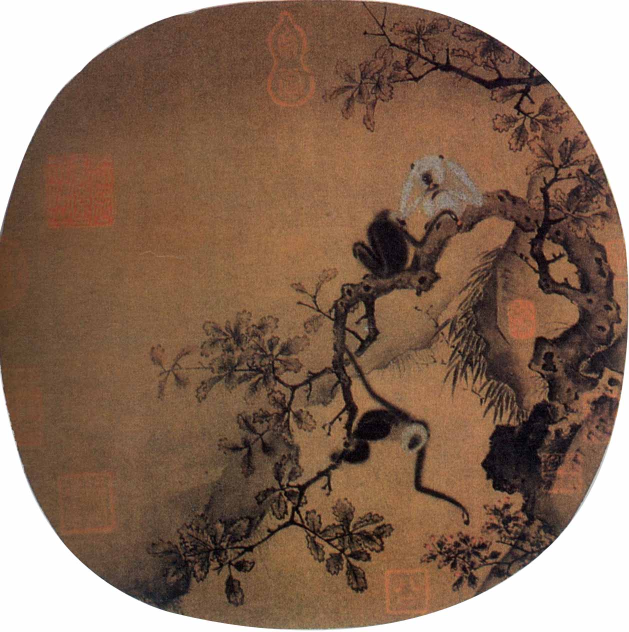 此图绘深山野林中,三只猿猴攀援栖止于树枝上。其中两猿正品果嬉戏,另一猿右臂抓树,左臂摘取红果,形象生动可爱。作者运用极为工细的笔法,描绘猿猴茸茸的细毛、灵巧的动态以及老树的虬枝和枯叶,显示出深厚功力。图中坡石用小斧劈皴,枝叶用双钩填色,笔法精工巧丽。