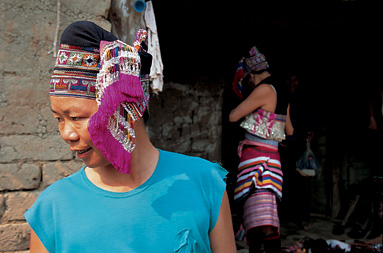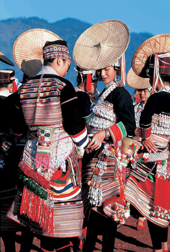 除了嫁衣,花腰傣女人平时的装扮一点儿也不含糊。尤其是她们的节日盛装,衣服、银饰、竹篾帽子,共同组成了一套正统的花腰傣民族服装。而且通过服装,一眼就能分出哪些是已婚妇人,哪些是未婚的少卜(花腰傣人称少女为“少卜”)。