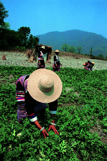 每年的五六月是傣家甘蔗收获的季节,刀阿姨和白师傅一早就到地里收甘蔗去了。由于天气炎热,他们午后都不出门劳作,女人缝衣刺绣,男人做些手工艺活,整个村庄显得安静祥和。和他们的族人一样,“花腰傣” 是农业民族,以种植水稻和甘蔗为主。在历史上与其他地区的傣族一样,主要种植糯米,在日常生活中也喜欢食用糯米。男人都善于上山捕猎,也善于下河打鱼捕鳝,白师傅以前是出色的猎手和捕鱼高手,国家禁猎以后,白师傅只在河水涨起的季节去捕些河鱼来添加口味。由于农务不算繁忙,刀阿姨和白师傅在农闲时光就做一些刺绣和竹编手工艺品,节假日拿到不远的漠沙镇去卖,生活显得丰富而有色彩。