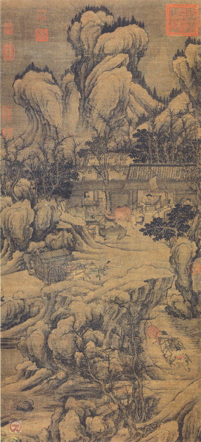 门前牲畜槽旁四只疲惫的骆驼或立或卧,客栈内则有伏案打盹的客人及服侍的伙计,客栈、车辆以墨笔绘出,刻画细致,结构妥帖,却无丝毫刻板。屋后树木簇拥,唯山峦主峰突起,山势险峻巍峨,笔致颇见宋人山水特色。