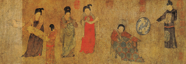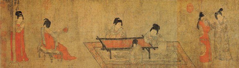 此图为绢本设色,因画中有宫人挥扇而得名,描绘宫廷妇女在夏日纳凉、休憩、理妆、观绣等生活情景。全图共十三人,她们神色倦怠,眉宇间若有所思,正无聊地打发时间,画里传达出夏日迟暮淡淡的忧伤。画面构图简洁,不作背景,人物以相关活动自成段落,又相互呼应。