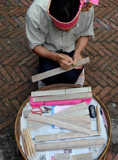 傣族园民间艺人在用晒干的贝叶镌刻傣族文字