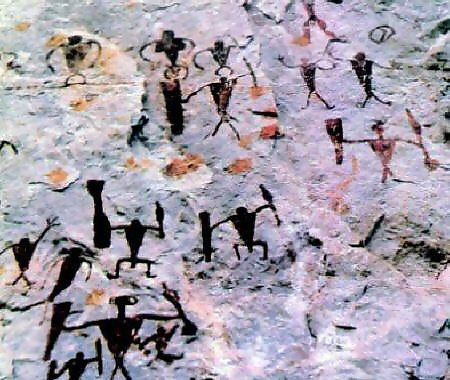这面崖壁,表面较为平整,上部有岩厦,崖面上绘有人物和动物。总的来看,画人物、动物均不绘出细部,仅绘其轮廓,并强调某一富有特征的器官,牛突出了牛角,猴子突出了下巴;鹿有明显分叉的角……人物的五官并不画出来,只有头、颈、躯干和四肢,躯干一律呈倒三角形。有的人一看便知是男性,因为突出了生殖器;有的妇女则突出乳房或大肚子。