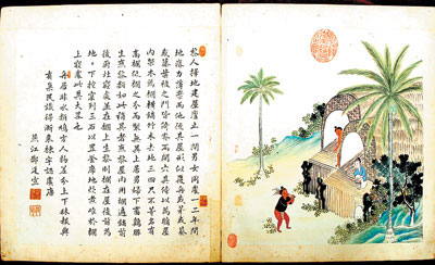 记者在省博物馆看到《琼黎风俗图》是一本一尺见方,共15开页,以图、文相配的形式描绘黎族群众建屋、编织、耕种、对歌、嫁娶、渔猎、贸易、涉水、谈判等社会风俗的册页。