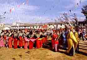 一切准备停当之后,人们便在头戴插有孔雀翎兜鍪、身着长衫,手举长刀的神师“董萨” 和两位德高望重、倍受当地人们推崇的长者“脑双”带领下,排成两列纵队伴随着象脚鼓、芒锣、小三弦和葫芦丝乐曲,在广场上高高竖起的木牌前,紧密相连地围绕成圈边唱边舞。整个舞蹈动作简单,舞步刚健有力、节奏明快。数以千计的景颇族人在“脑双”的带领下,井然有序地不断变化着队伍行进的方向和路线。在舞队的行进中,英姿飒爽的青年男子,一边呼喊着口号一边挥舞手中长刀;轻柔婀娜的少女们随舞步频频摇动彩帕,好似彩蝶纷飞、万花飘落。在这个被人们又称为“万人舞”,漫长、庄严而充满欢乐的仪式舞蹈中,人们忘却了时间与劳累,沉浸在用自己的舞步重蹈着古代祖先们自西北至云南的迁徙之途。舞蹈者庄重肃穆的神情、顿步前行的舞姿和忽起忽落的合唱,使在场的人们深深地被这种显示景颇族对祖先与故地的怀念和对民族迁徙衷心赞颂的精神所感动。