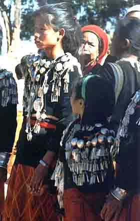为了能参加盛大的《木脑纵歌》集会,不少人在活动的前一两天就踏上赶赴会场的路程。正月十五日清晨,来自各方的人们身着盛装陆续集中到集会广场,等待着活动的开始。届时,在盛会中参加礼仪的姑娘们,各个头戴红穗筒帽、身穿带有红色花纹筒裙和黑色圆领对襟短上衣,上衣外披锡质银泡相连的披肩,在明媚的阳光照耀下,衬托出年轻姑娘们的端庄俊美与无限的活力。青年男子们也各个身挎腰刀,分别头缠末端绣有各种花纹图案和缀有小绒球的白色包头,表现着景颇男子特有的精悍与英武。