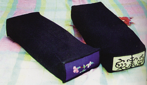 满族的布枕是布缝的,是长方形六面体,所以称之为方枕,但是方枕的长、宽、高又有许多不同,有单人方枕、双人方枕、扁枕、耳枕、空枕、对枕等品类。枕头里面要塞进植物性填充物,将枕头楦起来,既保暖,又松软。这些填充物,是撷野生植物的叶、花或果实,经济、实惠,又有药疗作用。如荞麦皮、洋铁叶子、山菊花、蒲棒等。