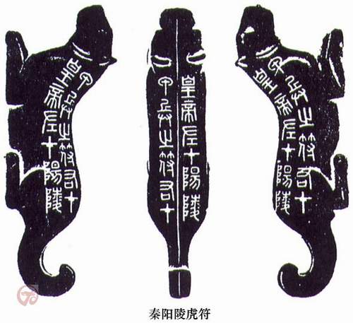 虎符为调兵之符信,是国家重器,制作精美,有的甚至采用错金手法,现存有《阳陵虎符》、《新郪虎符》和《杜虎符》,至今字迹完好,是秦小篆的重要遗存,具有很高的文物价值和艺术欣赏价值。