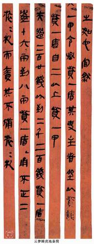 主要是《云梦睡虎地秦简》。1975年在湖北云梦睡虎地发掘墓葬12座,时间是战国末年至秦。其中4号墓出土木牍2件,内容是家书;11号墓出土竹简约1150件,内容主要是墓主喜的编年记等,最晚至公元前217年,距秦立国已经过了4年时间。其书写风格有较大的变化,可能反映了不同时期隶书的发展水平以及书写者的书写水平。从整体上看,介于篆隶之间,而隶书的因素已经非常突出。