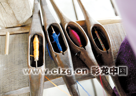 织户家中摆在织布机上缠绕着各种颜色线圈的梭子。记者曲鸣飞/摄