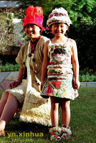 这套树皮童装(前)是张树皮2003年缝制的,并在当年9月举行的云南民族风格赛装节上获银奖。