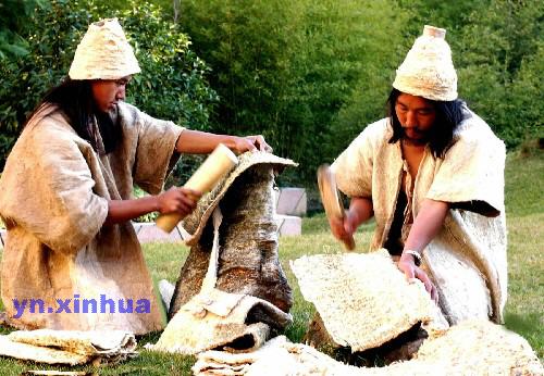 张树皮(右)与同伴一道对去浆后的树皮进行轻捶,以增加其柔软性。