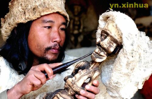 云南省勐腊县坝落寨哈尼族民间艺人张树皮在加工树皮雕塑“哈尼老人”。