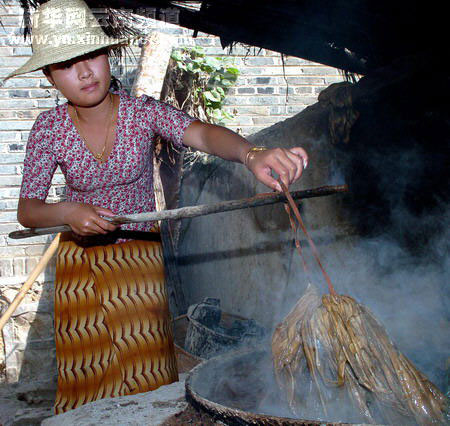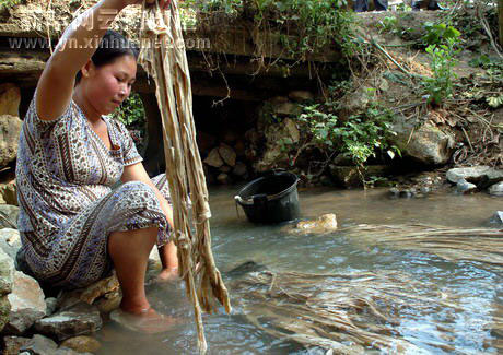 芒团村傣族妇女丙娥在洗煮过的构树皮。