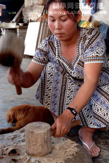 芒团村傣族妇女丙娥用木棰砸洗好的构树皮以捣成浆。