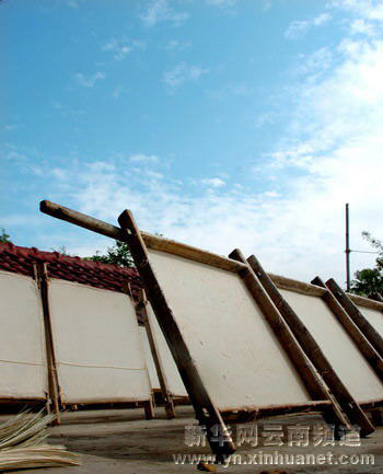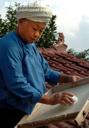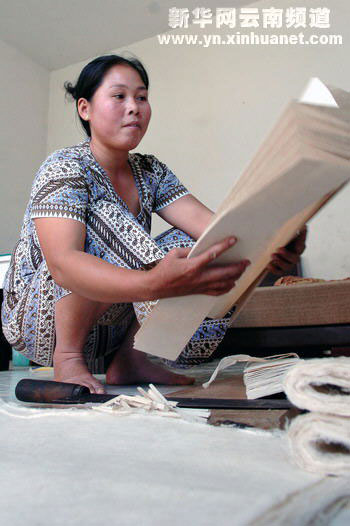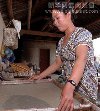 芒团村傣族妇女玉孟噶用木刮从抄纸器上接下晒干的纸
