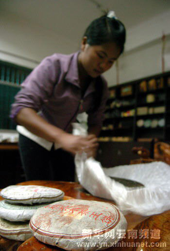 耿马傣族佤族自治县一家茶叶店里用“构皮纸”包装的普洱茶