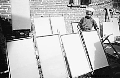2005年8月13日,“临沧傣族构皮手工造纸工艺”调查组一行5人从临沧出发,赴耿马傣族佤族自治县孟定镇和永德县永康镇进行实地调查。临沧傣族构皮手工造纸工艺保存得最完整的主要是孟定镇芒团村和永康镇忙石寨两个地方。我们进入忙团村时,正值天气晴朗、太阳高照,村里许多人家的场院里都摆放着纸簾子在晒新纸。孟定镇文化站的金紫明同志将我们带到常年四季都造纸的玉勐嘎家。在61岁的玉勐嘎家里,我们亲眼看见了古法手工造纸的完整过程。