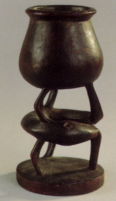 这是用整块木料雕成的一个杯子,情趣盎然。它上面是一个小杯,底座和杯身间刻着一条蛇,形成一个透空,似乎蛇在撑地托杯,构思奇特。