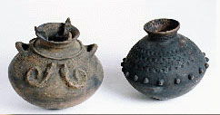 陶壶:古陶壶由祖先代代相传,加上排湾族有“壶生”的传说(太阳神产卵于大武山的陶壶中,并命百步蛇护佑孵化男女各一,繁衍种族),所以排湾族人把陶壶视为神圣物。一些古陶器距今已有上千年,由此可知排湾文明的久远。现今排湾族几乎不再制陶,拥有古陶器的贵族,地位更显尊贵。陶壶上的纹是各具代表意义,“山”代表女子,“云”代表男子,“菱形”代表海洋,“圆点”代表陆地,其中以“阴阳壶”最为尊贵。