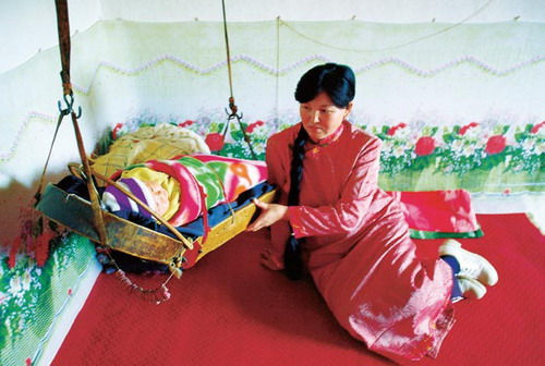 达斡尔族在养育婴儿时,需用“达日德”(即摇篮),过去多数人家都有。摇篮的使用虽然普遍,但在制作上却是很慎重的。要请心地善良、为人正派、手艺精良的木匠制作,认为这样的人制作的摇篮用起来才心里踏实、安然。而且摇篮制作者最好兄弟姐妹多或儿女多。摇篮的周帮材料,讲究从茂密的稠李子丛林中,选其树干弯向升太阳方向的稠李子树,单独的稠李子树或被雷击、风刮而倒下的稠李子树不能选用。认为独树难避风雨,用此种树木做材料,摇篮里的孩子会爱哭闹,而从树丛中选树木做材料,摇篮里的孩子才会健康,才会兄弟姐妹多,能互相照应。