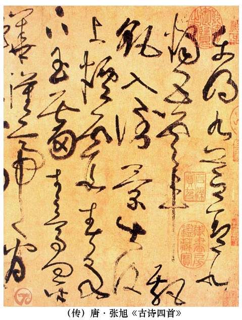 在汉字书法中,草书给人的动感最为强烈。萧衍《草书状》说草书有飞走流注之势,宋曹说:草书贵通畅。种种笔法,如人坐卧、行立、奔趋、揖让、歌舞、擘踊、醉狂、颠伏,各尽意态,方为有得。唐代著名草书家张旭,曾经观看舞者公孙大娘表演剑器舞,因而得悟草书的精意,杜甫有诗赞述此事,在书法史上传为佳话;又传闻他曾经见到公主和担夫争道,由彼此之间的动势而领会草书的要诀。因此,在后来的艺术家心目中,张旭的书法,已经充分表现了天地间各种事物的运动本质,故韩愈赞誉他说:旭之书,变动犹鬼神,不可端倪。