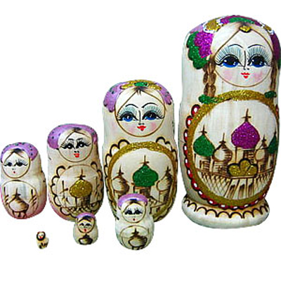 至于可爱的俄罗斯木娃娃为什么被称作套娃娃(matryoshka),这里面还有一番渊源呢,在旧时俄罗斯农村,Matryona和Matriosha是两个十分普通的妇女名字。学者们指出,这两个名字中含有拉丁词根“mater”,意思就是母亲。听到这个名字,人们很容易联想到大户农民家庭里的母亲,通常是一个健壮能干、略显肥胖,生育了许多孩子的俄罗斯妇女形象。而胖嘟嘟的木娃娃肚子里又藏着这么多小娃娃,于是套娃(matryoshka)就自然而然成了精雕细刻、色彩鲜亮的木娃娃们的名字了。