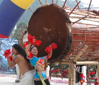 每年农历的十二月,基诺山鲜花盛开,欢声笑语。 寨子里的卓巴(长老)敲响了牛皮大鼓。人们情不自禁 地随着鼓点围着大鼓跳起粗犷的舞蹈,这就是基诺族喜庆丰收的民族舞蹈“太阳鼓舞“。