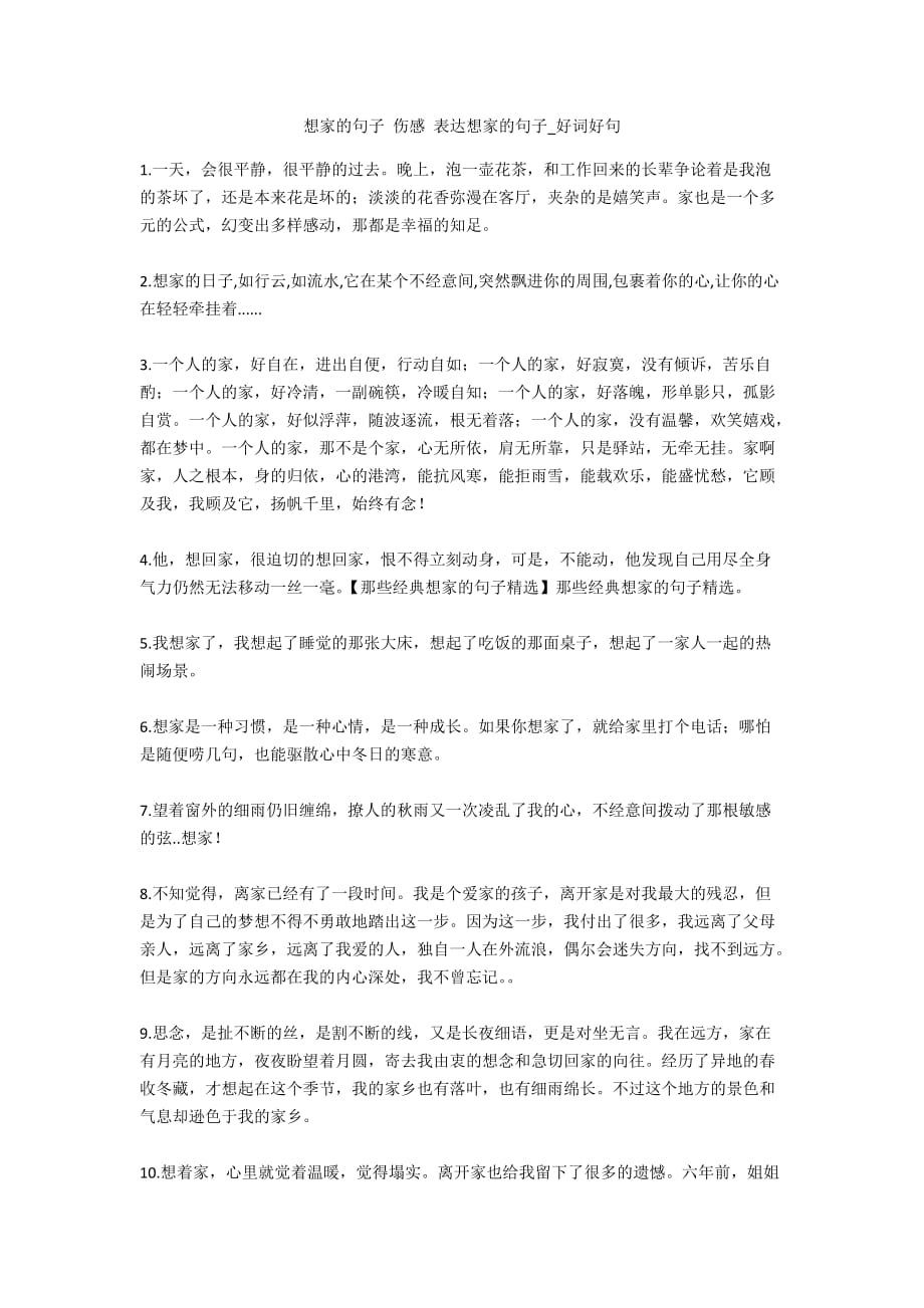 有关于想家的伤感句子 1故乡,是用来离别的只有这样才发觉出它的好,它的美来很多次,我都有一种错觉,以为转过这座桥,眼前就会有熟悉的景致出现,有熟悉的站名响起每每落空 2。十七 离开家,才知家的温暖离开家,才知自己也脆弱伤感又想家了,只是这一次只是在梦中和心中念想其实,想家是件美妙的事,可以好好怀念那些曾经经历过的美好时光啊! 十八 如果。