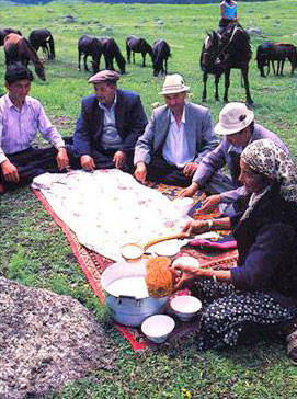 来到牧区,只要见到在哈萨克毡房不远的地方拴着七八匹马驹,那座毡房里准有马奶子,这家人肯定是“吉勒克齐”(哈萨克语:牧马人)。记得有一年,我和一位哈萨克族朋友按着这个经验,来到了一个牧马人的家里。果不出所料,在他们毡房门边挂的皮囊里,有已经酿制好的马奶子。那位哈萨克族朋友给我端过一碗,并告诉我这叫“克莫孜”(哈萨克语:马奶子),味道很好,营养丰富。一闻,奶香扑鼻,尝一口,冰凉凉的,味略酸还有一点点淡淡的涩味,但口感很好。从那以后,只要到了牧区,我总要找些马奶子来解解馋。