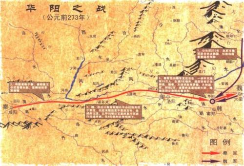 穰侯魏冉和客卿胡阳、武安君白起率军救援韩国。联军与韩军胶着于华阳,而华阳距秦地较远,魏、赵估计援韩秦军短期内不会赶到而疏于防范。白起采取出其不意、攻其不备的方针。大军由咸阳出发,以平均每日百里的急行军进行远途奔袭,仅8天就到达华阳城下。立即向魏军发起攻击,一举歼灭魏军13万人,生擒3名魏将,魏国宰相芒卯败逃。