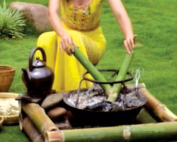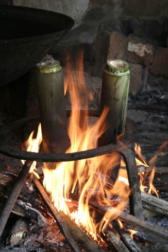 傣族喜欢饮用“竹筒茶”,傣族语“腊跺”,这是一种充满诗情画意的饮茶方式,先用晒干的春茶放入刚砍回的香竹筒内,放在火塘的三脚架上烘烤,6—7分钟后,竹筒内茶叶软化,用木樟将竹筒内茶叶舂压后再装进茶叶,这样边装、边烤、边舂,直至竹筒内茶叶填满舂紧为止,待茶烤干后,削开竹筒取出圆柱型的茶叶,掰少许茶叶放人碗中,冲人沸水约五分钟即可饮用。这种竹筒茶,既有竹子的青香,又有茶叶的芳香,非常可口。
