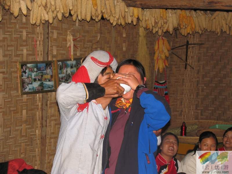 最有趣的莫过于“饮合杯酒”了。傈僳族称“伴多”,即两人共捧一大碗酒。这种饮法只有在大家酒兴最浓的时候才出现,而且总是由主人首先邀请。主客互相搂着脖子和肩膀,脸靠脸,然后一同张嘴,一口气饮完。于是酒从他们的嘴角,脸上淌下来,流到衣服上,而他们全然不顾。喝完了,互相对视,开怀大笑。合饮杯酒,只有在亲朋挚友或恋人之间进行,过去常常用于贵客来临、签定盟约、结拜兄弟的场合上,不分男女,两人共饮。一旦好客的傈僳族兄弟邀请你同他合饮杯酒,那就意味着他对你充满了信任,并愿同你建立诚挚的友谊。但是,晚辈人不能邀约长辈“伴多”,而且是长辈为晚辈人表示关心,对同辈人表示友好或者未婚男女相互爱慕才饮合杯酒。