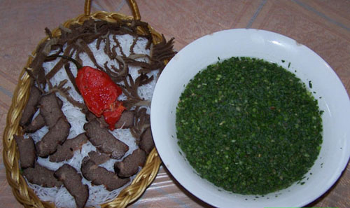 牛撒撇具有清凉解毒的功效,但要把这种东西吃进嘴里,确实得有点第一次吃螃蟹的勇气。当你皱着眉,苦着脸,吃下第一口牛撒撇时,正象大暑天渴极了喝进一瓶冰镇汽水那样,一股辣味—不,应该说是一股苦味从鼻腔直冲脑门,顿觉心清气爽,暑气全消!