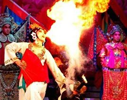 旧时演出用清油灯照明,用此特技。随着科学技术的发展,照明条件的改变,此特技已无人使用。