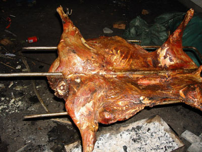 (3)将羊宰杀,去除内脏、头、蹄,悬在自制的炉灶里翻滚烘烤,直至出油,变色即熟。
