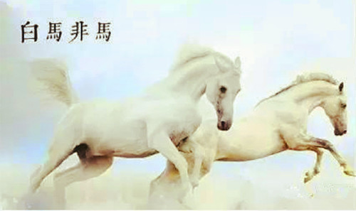 公孙龙:马本来有颜色,所以有白马。假使马没有颜色,就只有“马”而已,怎能称它为白马?但是,规定马是白色的马就与“马”有区别了。所谓白马,是马限定于白色的,限定于白色的马自然与马是有区别的,所以说白马非马。