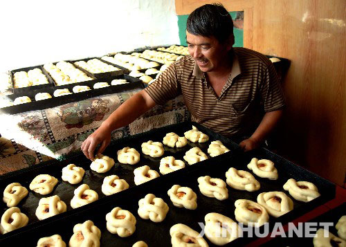 一名俄罗斯族男子在按照俄罗斯传统方法制作面包