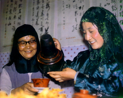 东乡人一日三餐,都是盘腿坐在炕上围着炕桌吃。妇女一般另席就餐。凡有客人到家,一定要让客人在炕上的首位坐下(坐位以炕内靠墙的为首位),然后端上盖碗茶、面饼、麦索、辣子炒土豆等款待客人。“麦索”是东乡族风味食品,将还没有完全成熟的青稞或大麦,摘下来蒸熟,用小石磨碾制成筷子头大小的柱状体,拌上大蒜、辣椒面吃,独具地方特色,是东乡人用以待客的珍贵食品。有时也用油香、手抓羊肉、鸡肉等待客。东乡人用鸡待客很讲究,主人必须将鸡尾先让客人吃,以示尊敬。倘若客人推辞,那就失礼了,会引起主人的不高兴。东乡族的陪客习俗也很有特色,男客人由男主人招待。一般男主人在炕边给客人添茶取饭,自己不坐也不吃,妇女一般避而不见;女客人由女主人招待,女主人可以陪同客人坐下一起吃。