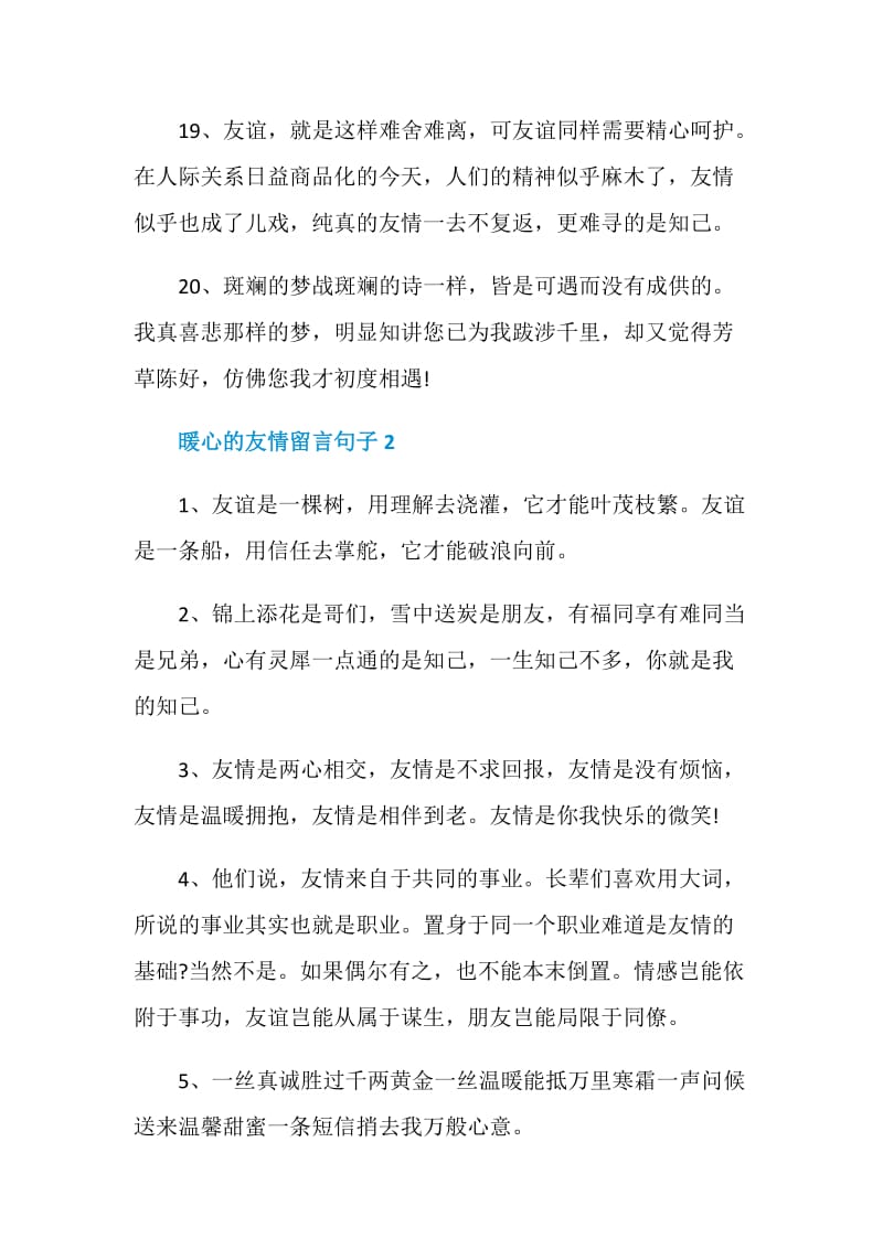 友情比爱情更可贵,小编整理了一些给朋友留言的暖心短句,欢迎阅读 1简短留言暖心句子 1千回百转是春心我的心以你为圆点,不停的围绕着你,魂牵梦绕大地复苏夏日将不会太远,我们。下面小编带来的是形容友情的简短句子,希望对你有帮助1我们有了朋友,生命才显出它全部的价值2我们之间的真诚友谊好像健康,失去时才知道它的可贵3友谊是精神的融合。