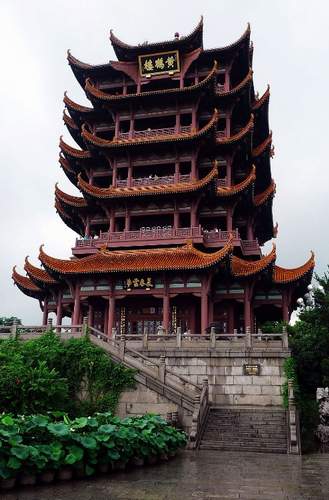 黄鹤楼为江南四大名楼之一(其余三座为江西南昌的滕王阁、江苏镇江的北固楼和湖南岳阳的岳阳楼),原在武昌城西南二里的黄鹄矶上。有的文章云黄鹄矶位于蛇山的首部,不确。黄鹄矶与蛇山并非一地。因1956年修建武汉长江大桥,要利用黄鹄矶作为桥墩底座,方将黄鹤楼由黄鹄矶迁于今址——蛇山之上。黄鹤楼始建于三国时代的孙吴,据《元和郡县图志》:“吴(大帝孙权)黄武二年(公元223),城江夏以安屯戍地也。城西临大江,西南角因矶为楼,名黄鹤楼”。因兵燹、水患诸原因,屡遭毁坏亦历代都有兴建,而且建筑样式皆有所不同。现今的黄鹤楼为1993年武汉市政府所建,样式仿唐,楼高七层,外圆而内方。至于为何叫黄鹤楼,有各种说法,但都与仙人过境有关:《太平寰宇记》云:“昔费文玮登仙,每乘黄鹤于此楼憩驾,故号为黄鹤楼”;《南齐书·州郡志》则记为仙人王子安:“夏口城据黄鹄矶,世传仙人子安乘黄鹄过此也”。武汉当地还有个传说,说有位辛氏曾在城西矶头卖酒,有个道士前来饮酒数坛不醉,辛氏知是奇人,殷勤供奉而不索一文,道士临别时,取佐酒之桔皮画鹤于粉壁之上,每有客前来饮酒,鹤即起舞,四方闻之,前来饮酒观看者塞途,辛氏亦因此致富。十年后,道士再来酒店,以手招鹤,遂跨鹤而去。辛氏遂于此处建楼以供奉。