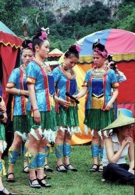 南部侗族地区的服饰则迥然不同。由于地处山区,交通不便,因而至今仍保持着较为古老的裙装。南侗善绣,服饰极为精美,女子穿无领大襟衣,衣襟和袖口镶有精细的马尾绣片。图案以龙凤为主,间以水云纹、花草纹,下着百褶裙,脚蹬翘头花鞋。髻上饰环簪、银钗、头戴盘龙舞凤的银冠,并佩戴多层银项圈和耳坠、手镯、腰系腰带,银腰萎,青布包头,下着宽大长裤,穿草鞋或赤脚。盛装时穿古老的、百鸟衣、银朝衣、月亮衣等等。