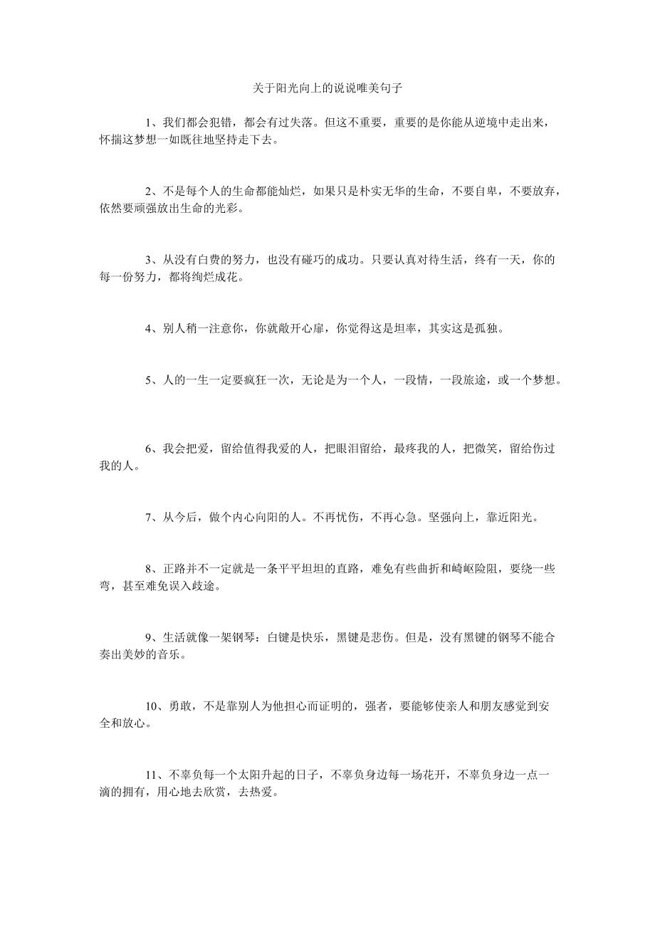 2019年11月24日导语乐观是每个人都该拥有的好心态,乐观积极的人可以让我们学到很多东西下面是小编带来的乐观积极向上唯美句子,欢迎大家参考阅读 乐观积极向。2017年6月22日阳光积极的的句子经典 只有阳光知道向日葵心中的秘密也只有向日葵知道,阳光将去哪里 1我们常常会为了一个眼前的人义无反顾,却很难为了一个说不。