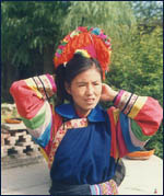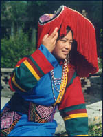 捺仁扭达这种头饰最显眼的地方,是在脑后边向前竖起一根铜制的叉剑,所以也称其为三叉头。这种头饰的背后有一个直径10多厘米的圆盘,盘是用贝壳、珊瑚、松石等小珠子串盘而成的,其上饰有铜管、铜片、瓷珠、丝穗等小物件,依土家族的习俗小物件多为美。